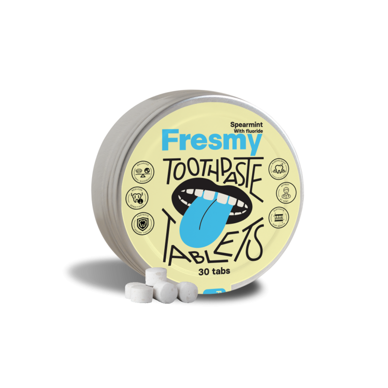 Fresmy rohemündimaitselised hambapesutabletid (30 tk) on ideaalne looduslik valik värske hingeõhu ja puhaste hammaste heaks – eriti mugav reisile. Fluoriidivabad, sisaldavad hüdroksüapatiiti ja ksülitooli. Vegan ja plastivaba – saadaval It's Bio e-poes.