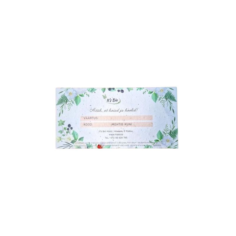 Kingi olulisele inimesele oma elus It's Bio seemnepaberile trükitud kinkekaart, mis on valminud käsitööna ümbertöödeldud pabermassist ja põllulille seemnetest. Pärast kaardi kasutamist võib kingisaaja selle paberi kas potti või peenrasse istutada ning taimede sirgumist imetleda.