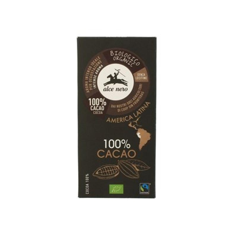 Alce Nero 100% kakaosisaldusega mõru šokolaaditahvel on valmistatud puhtast kakaomassist, kakaovõist ja vanillist – ilma lisatud suhkruta. Sobib neile, kes hindavad intensiivset kakaomaitset ja soovivad vältida magusaid lisandeid. Looduslikult esinevate suhkrutega, sügavalt šokolaadine ja vegan-sõbralik maius.