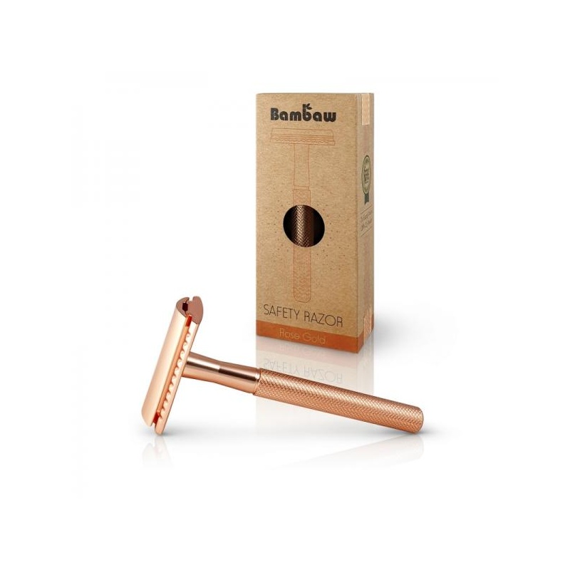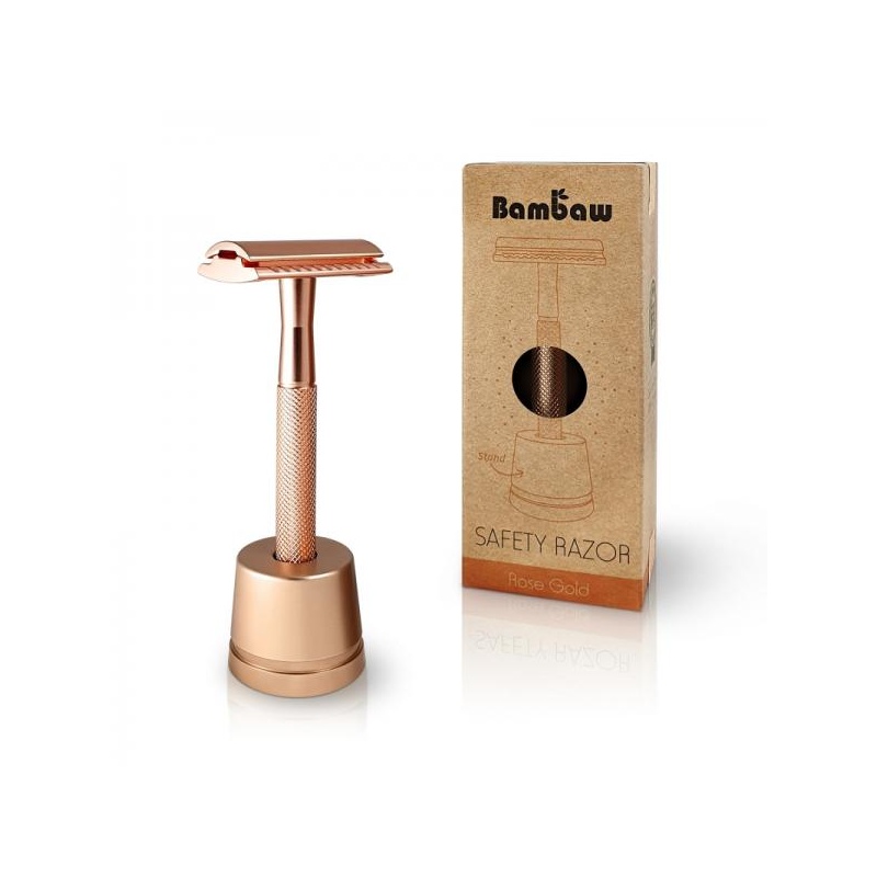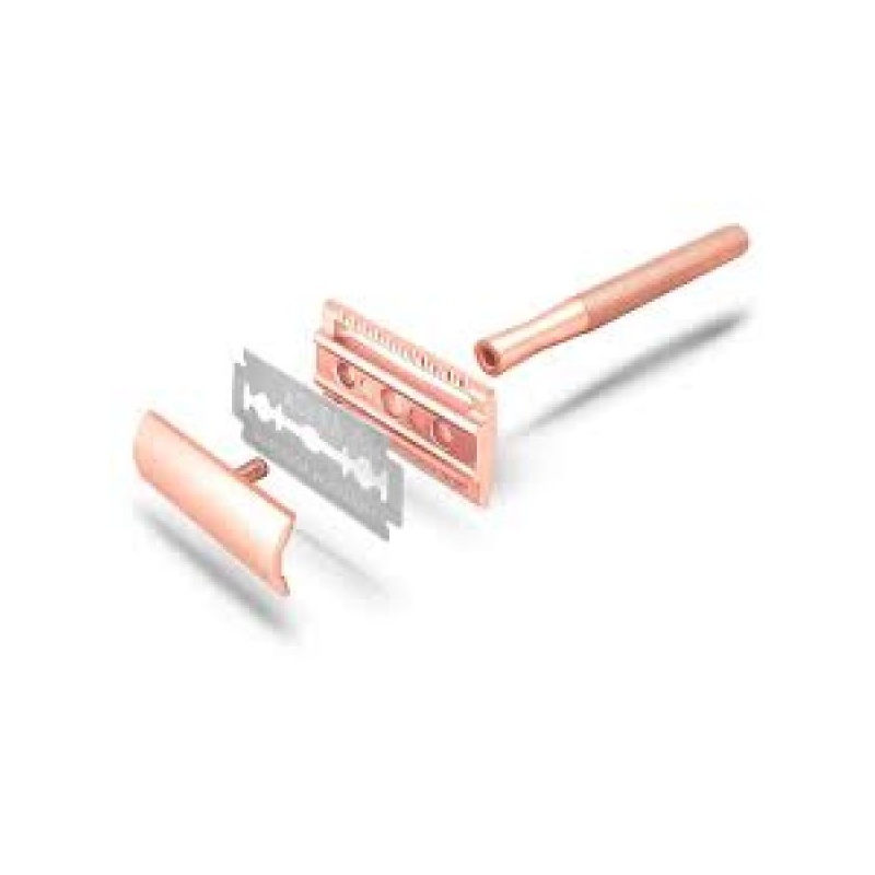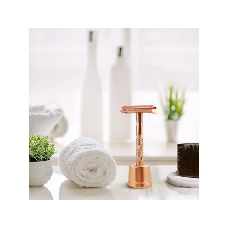 Stiilne ja modernne roosakas kuldse viimistlusega metallist raseerija, mis tuleb koos praktilise alusega. Vastupidav ja plastikuvaba valik neile, kes eelistavad teadlikku ja kestlikku hooldust. Sobib kasutamiseks vahetatavate teradega ning tagab sileda ja nahasõbraliku raseerimistulemuse.