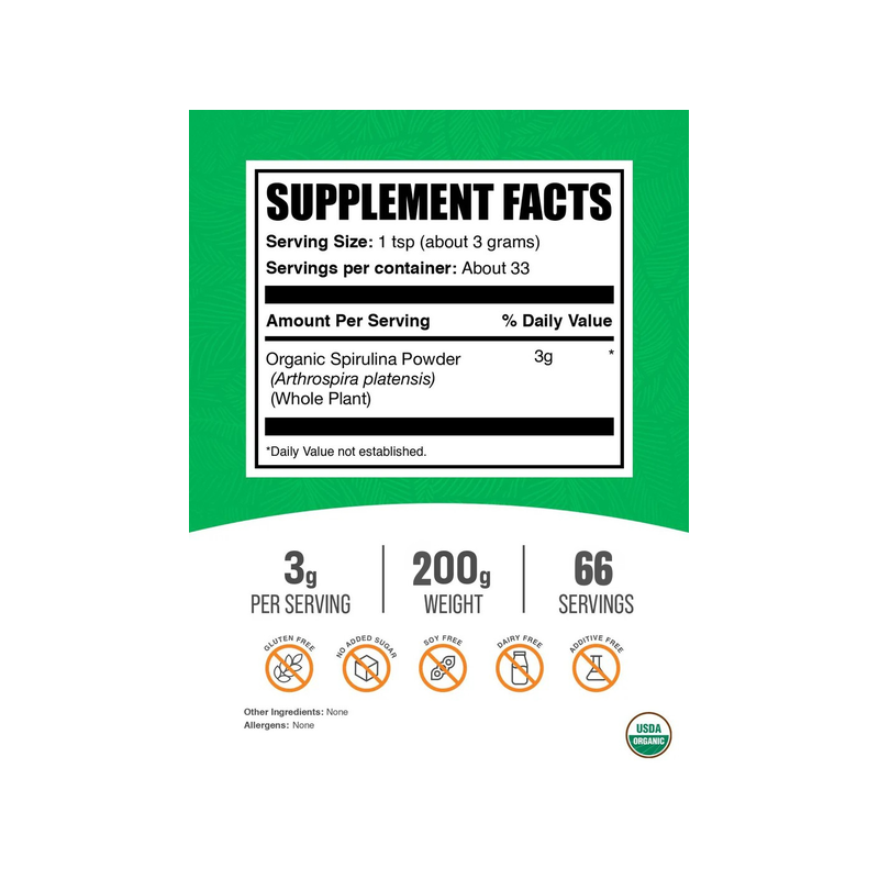 Meie mahe spirulina pulber on valmistatud kvaliteetsest, kiiritamata ja GMO-vabast toorainest. Tegu on puhta, 100% orgaanilise pulbriga, mis sobib ideaalselt smuutidesse, veega segamiseks või teiste taimsete jookidega tarbimiseks.